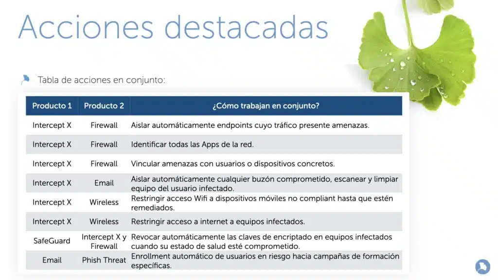 En este apartado, Eric nos propone una tabla con las funciones que pueden realizar los diferentes productos de Sophos cuando estos trabajan conjuntamente.