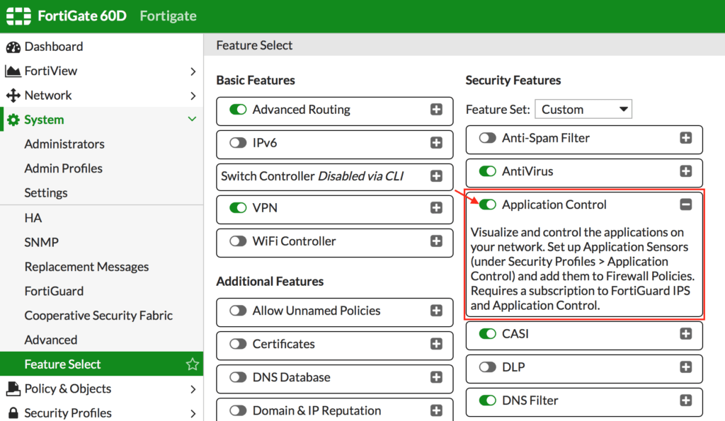 A continuación, habilitaremos la característica de Application Control en el sistema. Para ello accedemos a “System —> Feature Select”, habilitaremos “Application Control”: